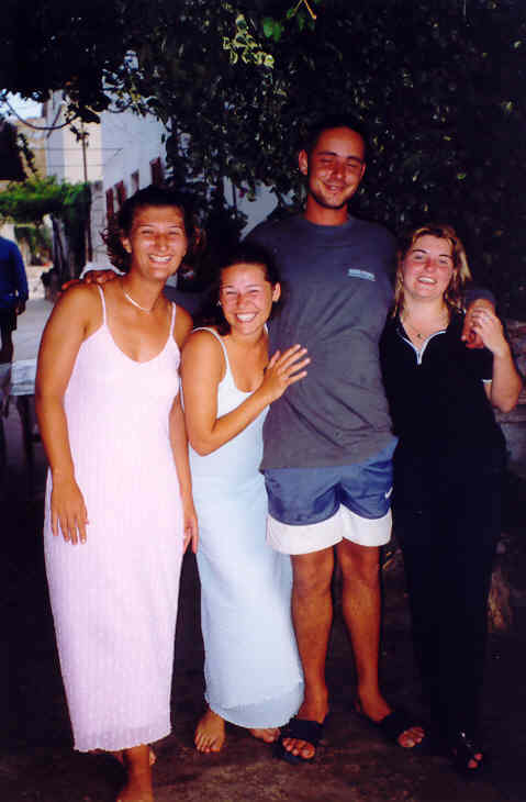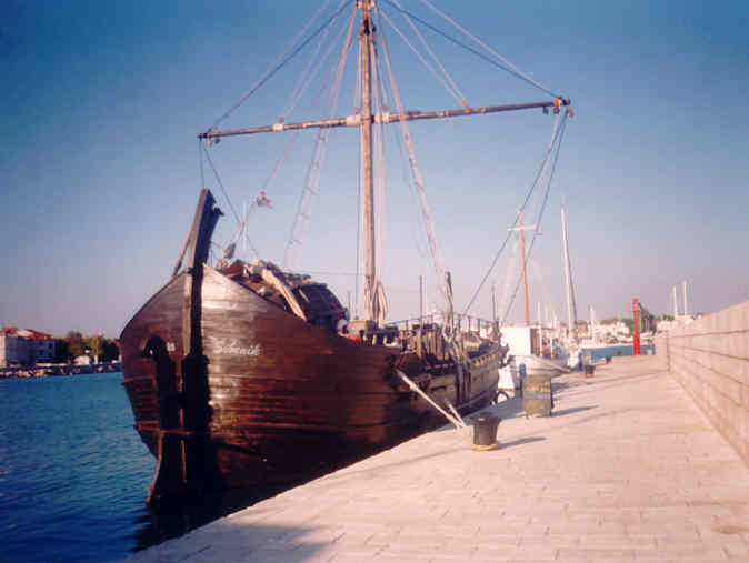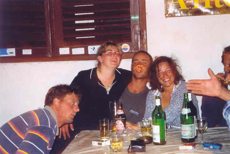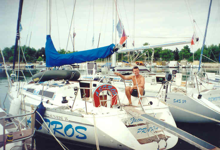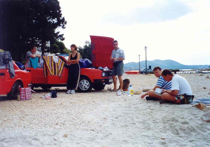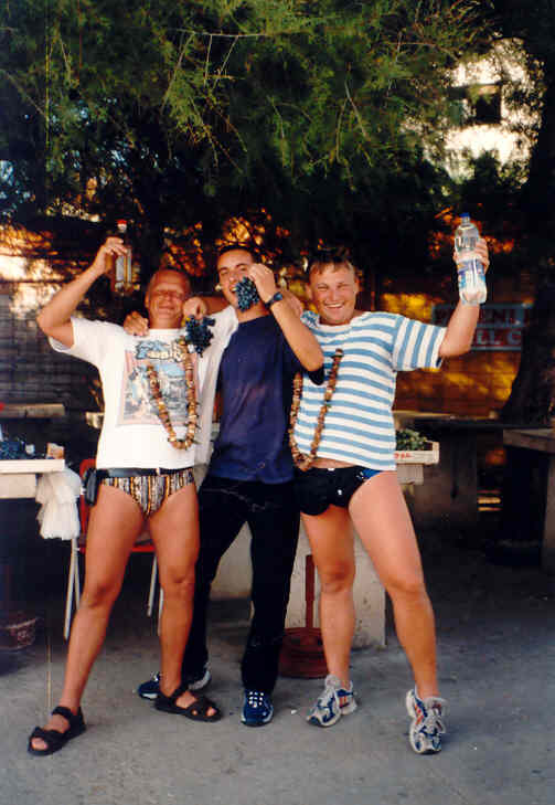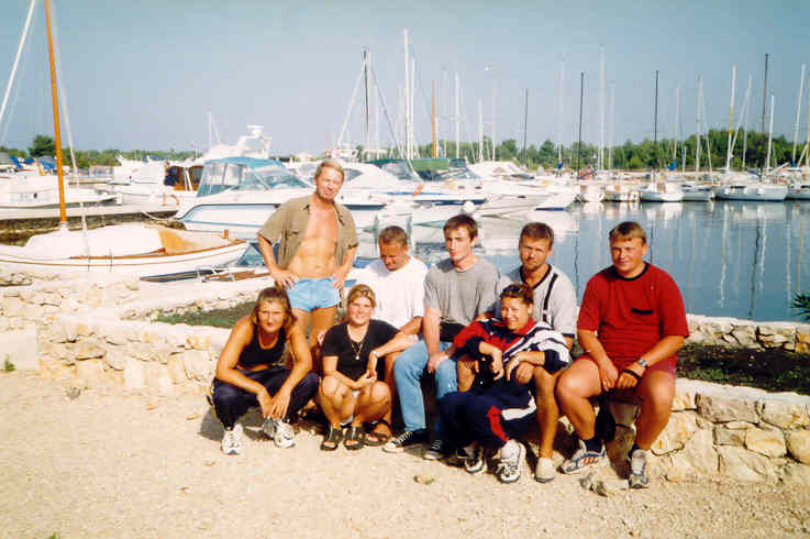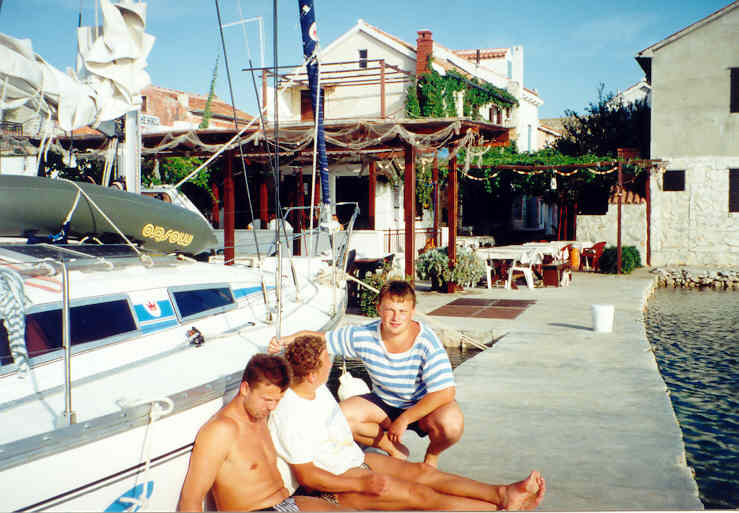 Kolem 16.00 hodiny dorážíme k našim přepravním vozidlům, naše prohlídka je u konce. Jsme nadšeni a pokračujeme v cestě k pobřeží. Naším cílem je Pakoštane, městečko na břehu Jaderského moře nedaleko místa našeho nalodění. Zde se ubytujeme přímo na pláži a po krátké koupeli v moři vzhůru za kulturou do nejbližší vinárny pod širým nebem. Vybrali jsme si GRGO DALMATINSKO, kde nám nabídli domači vino, bijelo i crno. Vzali jsme si od obojího, míchali ho z místní minerálkou a moc dobře se nám sedělo. Při této příležitosti jsme také ujasnili hierarchii na naší lodi. Jindra se stal 1. důstojníkem, Petr a Láďa povýšili na 2. a 3. důstojníka a 4. důstojník, tzv. důstojník pro styk s posádkou, se stal Radek. Obě Markéty a Renata se staly řadovými členkami posádky a kdosi správně konstatoval, že máme mužstvo složené ze samých žen. Děvčata, snad vlivem vína, neprotestovala a nám se tato skutečnost náramně zamlouvala. Ujednotili jsme také poslední interní předpisy, kterými se budeme řídit v průběhu plavby. Především pak skutečnost, že pro dobro všech bude vládnout na naší lodi demokracie zaručená případným hlasovacím právem každého námořníka, přičemž každý člen mužstva má jeden hlas, 1. důstojník pět hlasů a ostatní důstojníci po čtyřech hlasech. Už toto první demokratické rozhodnutí bylo kvitováno s povděkem, o čemž svědčí poměr hlasů 17:3.