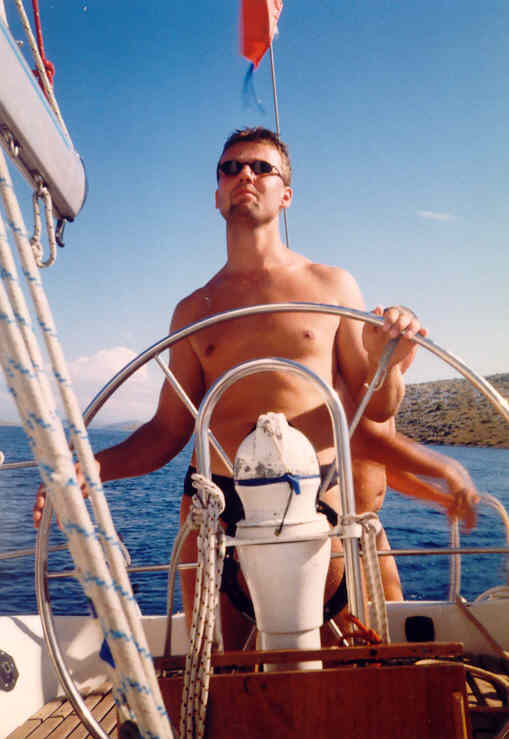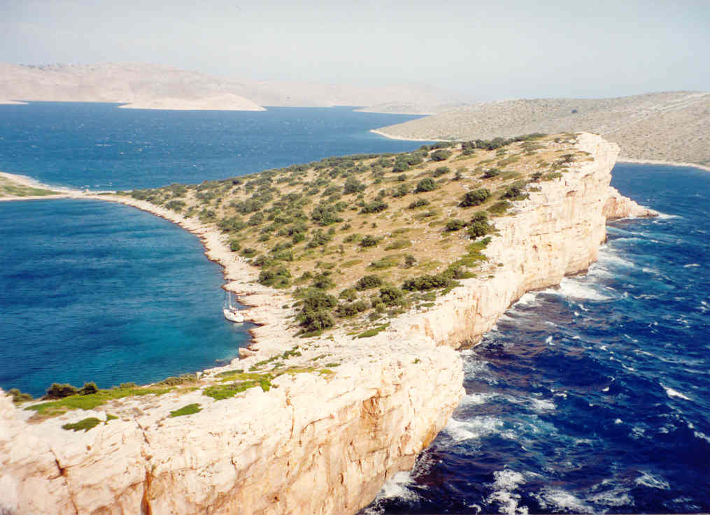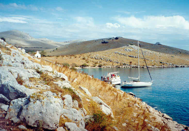 Krátce po snídani vyrážíme na moře, které se pod stále sílícím jižním větrem zvaným Jugo začíná měnit v pekelné místo jako stvořené pro naši ďábelskou jízdu. Plujeme stále severozápadním směrem do útrob Kornát s větrem v zádech. Střídáme pravý a levý zadobok a z plachet máme vytažen pouze malý kapesníček kosatky. Přesto je naše rychlost 6 až 7 uzlů. Během chvilky jsme na Kornátech a na oběd přirážíme k molu u ostrova Ravni Žakan. Našimi sousedy jsou potápěči na pěkném dvojstěžníku, zřejmě Italové.
