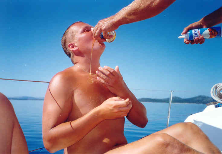 Provedli jsme večerní očistu v moři, někteří důstojníci (Petr a Jindra) předvedli mužstvu secvičenou sestavu tandemového plavání. Ovšem mužstvo to samozřejmě neocenilo, ba co víc, provolávali cosi o kreaci dvou zchromlých akvabel. Po zakončení našeho vystoupení jsme jim oplatili stejnou mincí a vyhlásili CVIČNÝ ŽRALOČÍ POPLACH. Na to však reagoval pouze 2. důstojník Láďa, který se bleskurychle přesunul z vody na loď. Bylo nutné mužstvo za jeho přezíravé chování potrestat, a proto jsme vytáhli z vody schůdky, čímž jsme si konečně vynutili jejich pozornost. Jejich zmatek a verbální projevy se natolik přiblížili skutečnému ŽRALOČÍMU POPLACHU, že jsme jim schůdky zase spustili. V tu ránu byli na lodi.