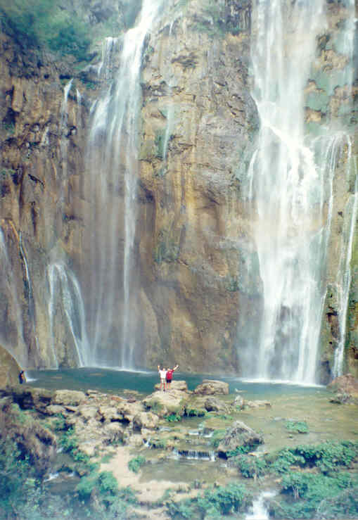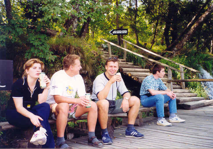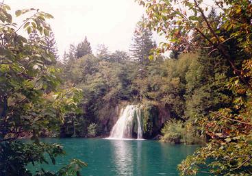 V 10.30 konečně dorážíme na Plitvice a začíná naše prohlídka. Volíme trasu po proudu a tudíž se necháváme vláčkem vyvést k horním jezerům a postupujeme směrem dolů po svých. Všichni jsou nadšeni a uchváceni tou nevídanou krásou. Voda v jezírkách je průzračně čistá a všude je spousta ryb. Jednotlivá jezírka na sebe navazují malými i velkými vodopády, voda se blýská ve slunci a s šuměním nebo hřmotem dopadá a tříští se do drobných kapiček, které jsou všude kolem, obklopují Vás jako chladivá pára. Popojdete-li kus, pak utichá zvuk jednoho vodopádu a jiný narůstá. Vnímáte to a víte, že je před Vámi další krásná scenérie a v očekávání postupujete. Každý úsek cesty překvapí něčím novým a na každý obětujete snímek. Asi v půli prohlídky, kdy už jsou mnozí upachtěni, potěší krátká plavba lodí, která Vás zaveze přes největší jezero do druhé poloviny parku. Zde se občerstvíte v některém ze stánků a můžete pokračovat k největším vodopádům a kaňonům. Právě v této části Vás čekají známé scenérie, které mnozí již znají z filmů o Vinetouovi (Poklad na stříbrném jezeře).